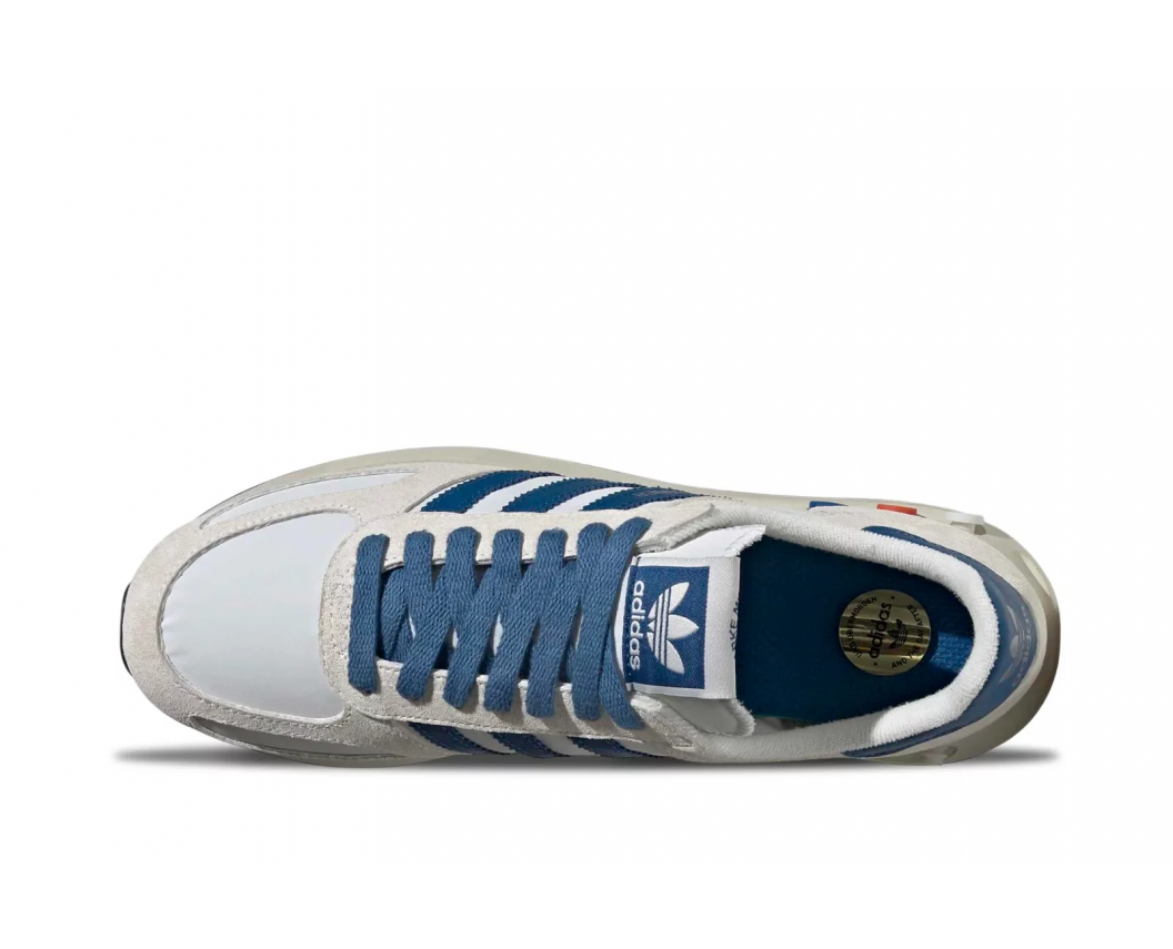 Верх моделі створений із поєднання міцних матеріалів: основа виконана зі шкіри, а ключові зони, такі як носок і п’ятка, доповнені м’якою замшою кремового відтінку, що додає глибини та фактурності. З боків розміщені фірмові три смужки із зубчастим краєм у контрастному синьому кольорі, які підкреслюють належність до лінійки adidas Originals.